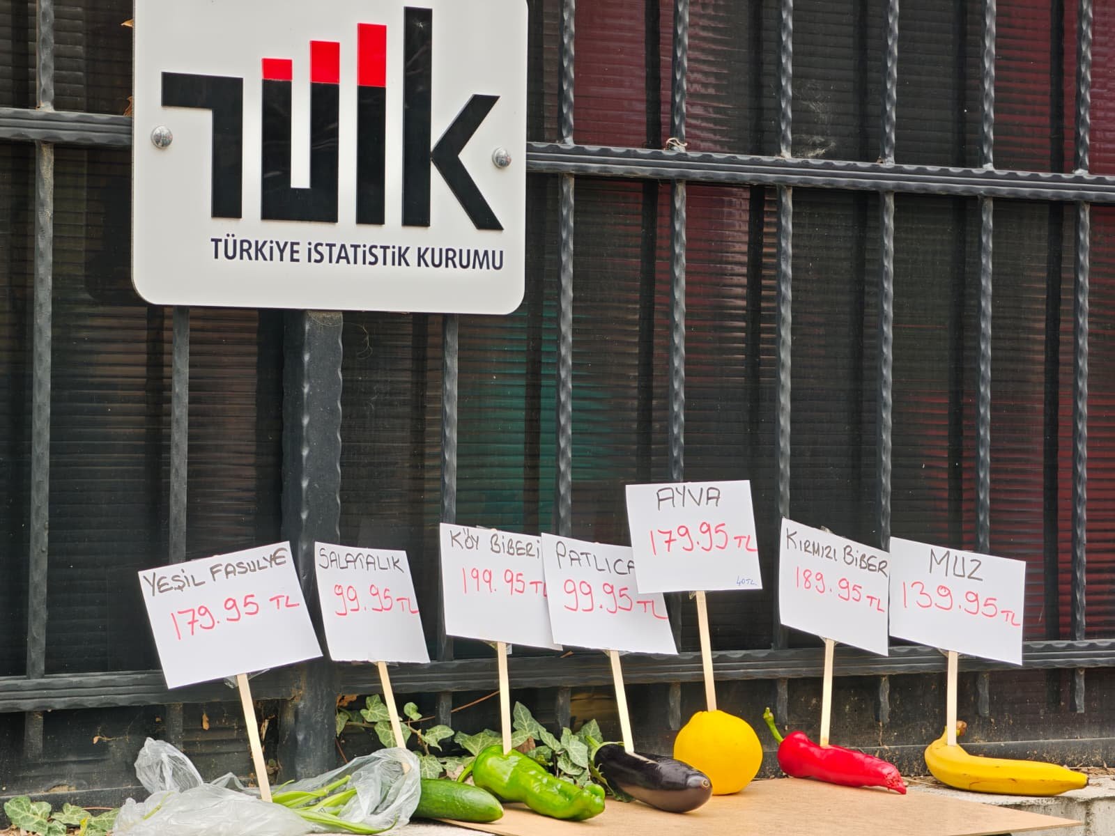 Açıklamanın ardından konfederasyon üyeleri, TÜİK binasının önüne sebze ve fiyat etiketlerini bıraktı. (DHA)
