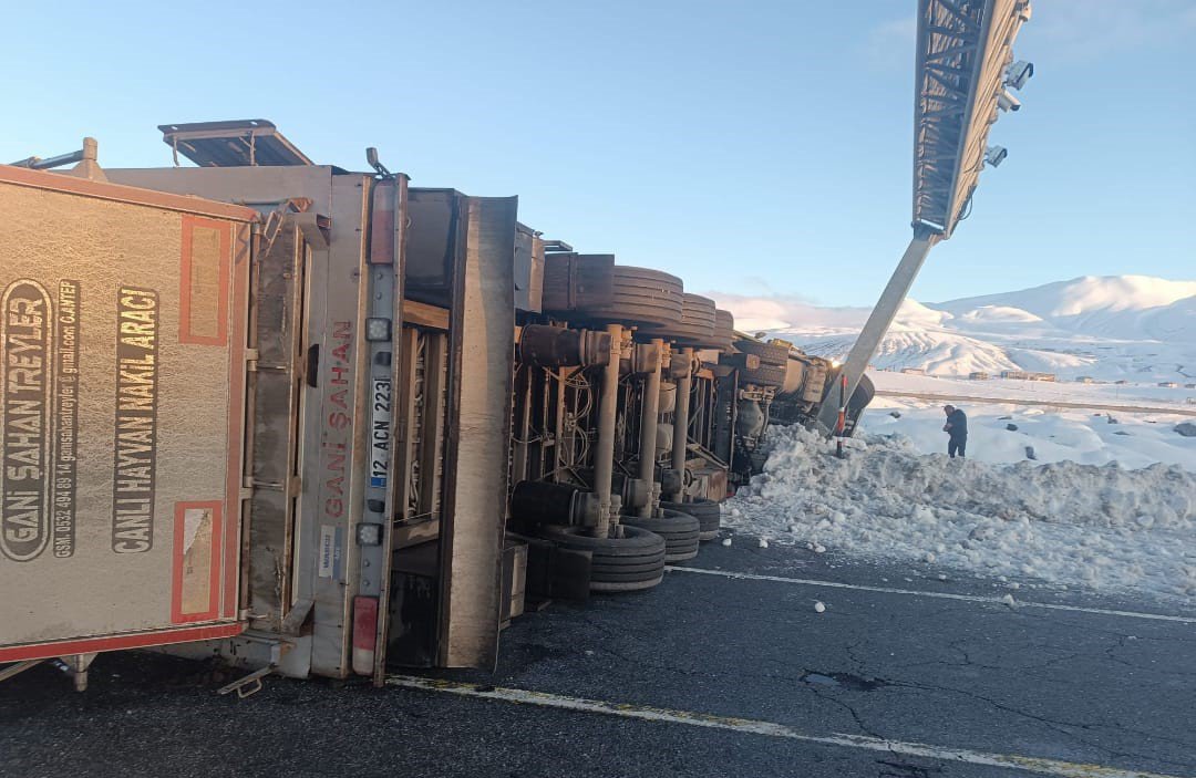 Özcan ÇİRİŞ/BİTLİS, (DHA)- BİTLİS’te yoldaki buzlanma nedeniyle 2 TIR’ın devrildiği kazada şoförlerden biri yaralandı. TIR’lardan birinin taşıdığı 10 büyükbaş öldü.