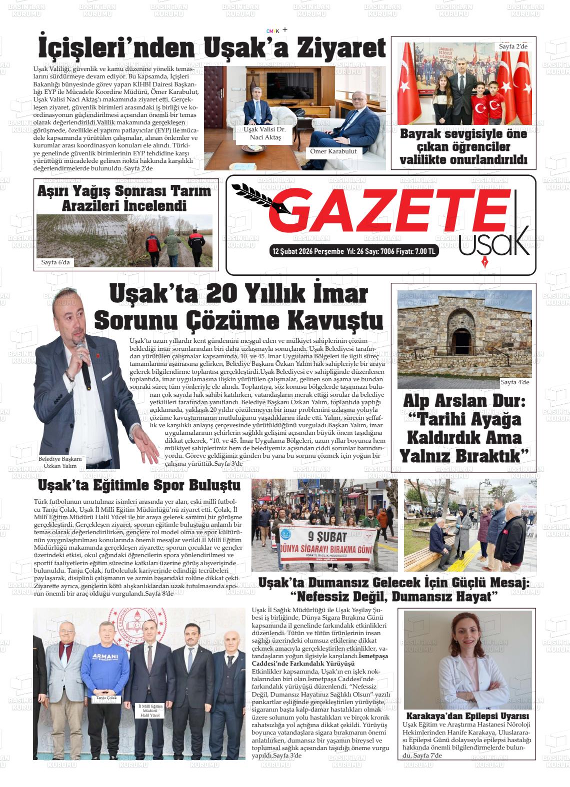 Uşak Yerel Gazeteleri 12 Şubat 2026, Perşembe Günü Manşeti
