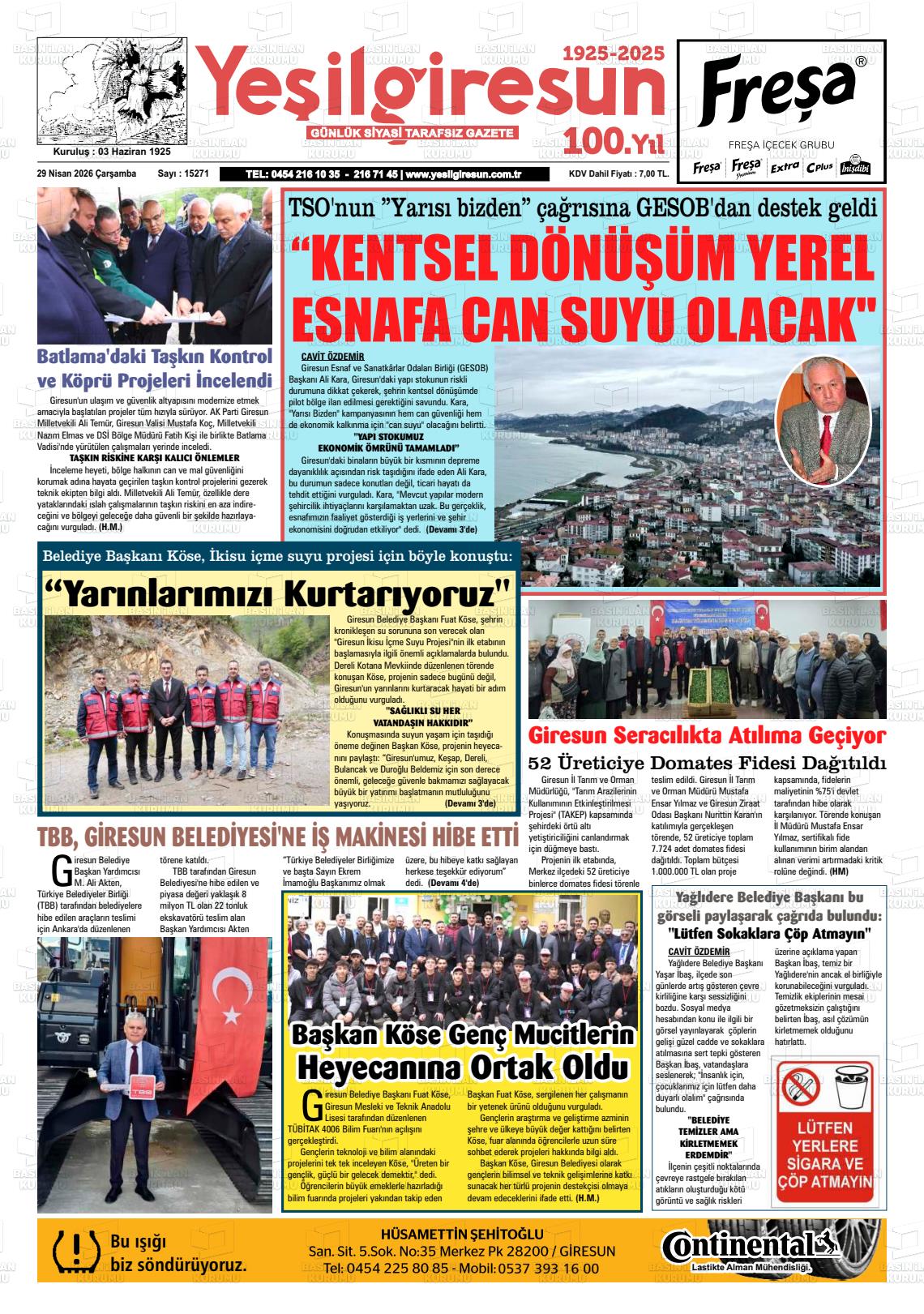 Gİresun Yerel Gazeteleri 29 Nisan 2026, Çarşamba Günü Manşeti