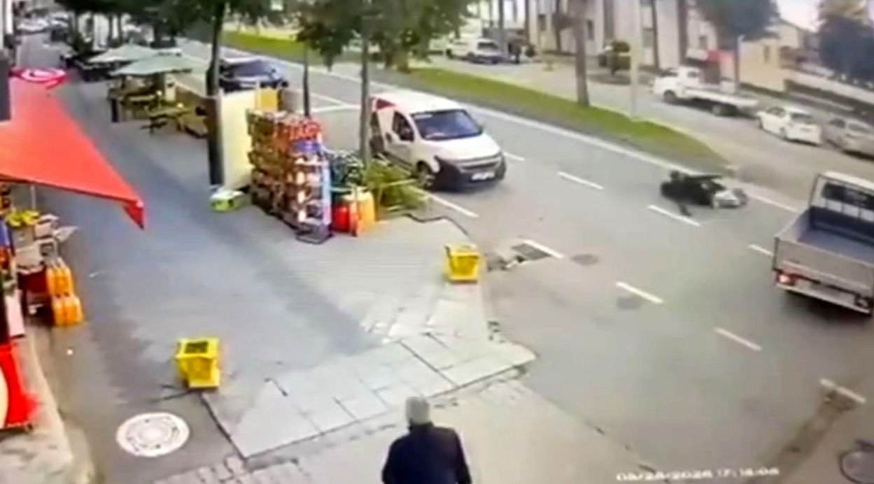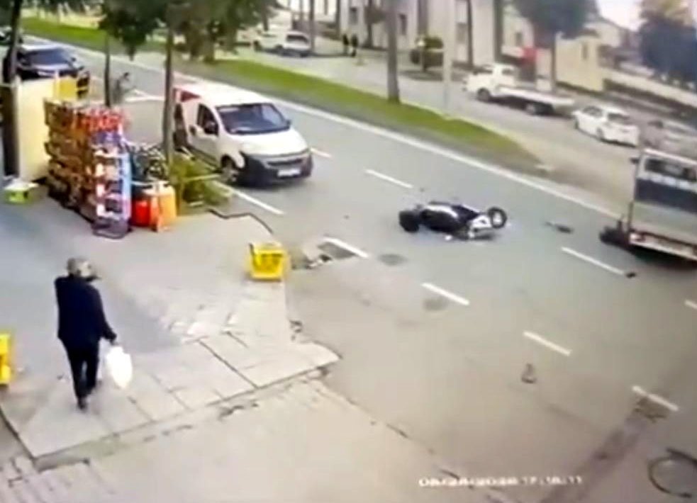 Öte yandan, polis ekiplerinin inceleme başlattığı kaza anı, çevredeki bir iş yerinin güvenlik kamerasına yansıdı. Görüntülerde, devrilip sürüklenen motosikletin kamyonete hızla çarptığı ve kazayı gören çevredekilerin yardıma koştuğu anlar yer aldı. (DHA)