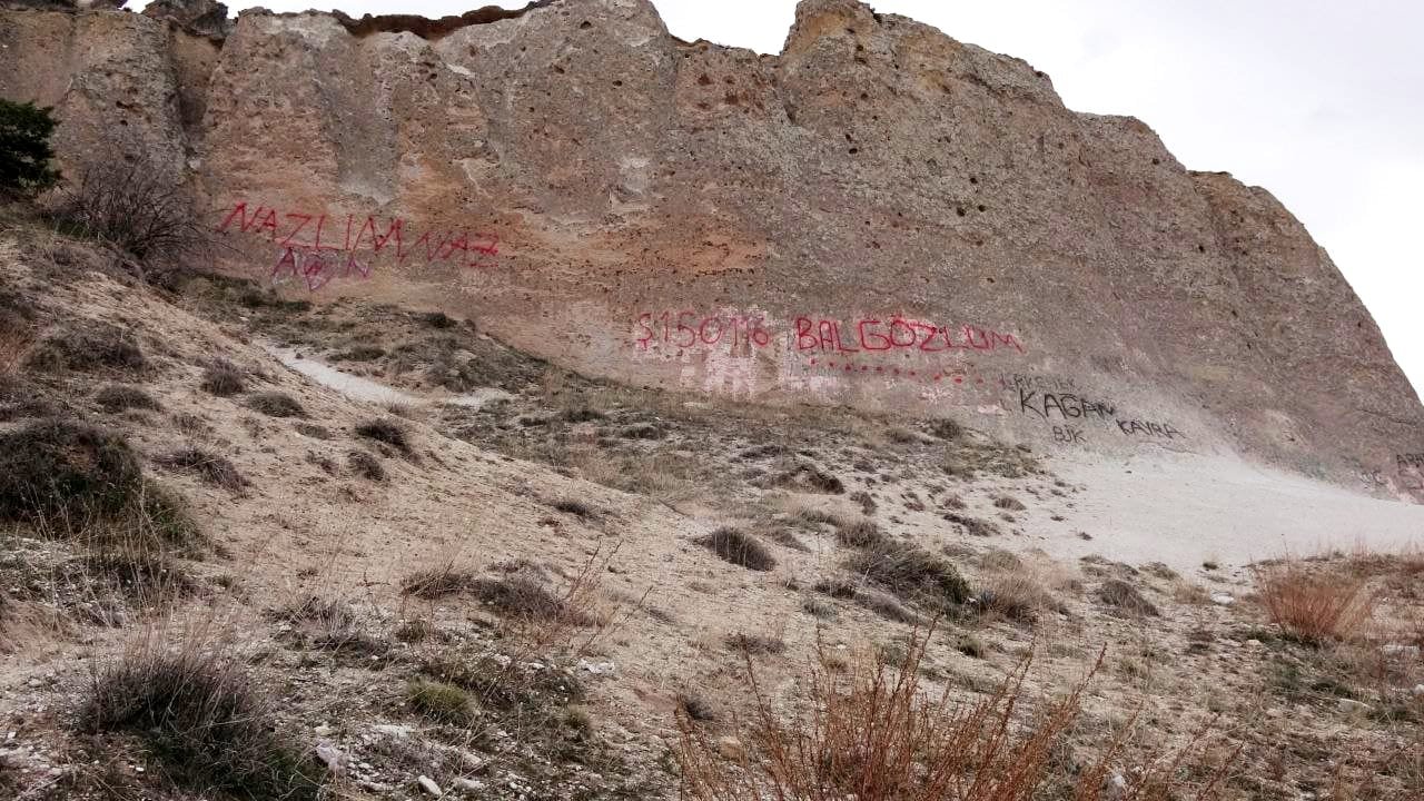 Metin DEĞİRMENCİ/YEŞİLHİSAR (Kayseri), (DHA)- KAPADOKYA’nın doğu girişinde yer alan Kayseri’nin Yeşilhisar ilçesinde sayısı yaklaşık 40’ı bulan peribacaları benzeri oluşumlardan bazıları, sprey boyayla yazılar yazıldı. Araplı Mahalle Muhtarı Ahmet Sal (56), “Burası bizim doğal görünümlü yerimiz. Sevdiğinizin adını yazmaya gerek yok, kalbinize yazın. Doğayı kirletmeyelim” dedi.