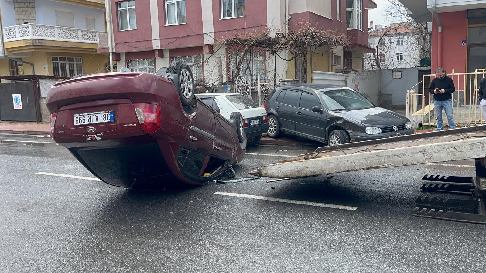 Kaza, saat 11.00 sıralarında Kocasinan ilçesi Yenimahalle 16’ncı Cadde’de meydana geldi. Y.S. yönetimindeki 38 AJR 999 plakalı otomobil, sürücüsünün direksiyon hakimiyetini kaybetmesi sonucu park halindeki 38 DN 746 plakalı otomobile çarparak takla attı. Kazada sürücü ile araçtaki B.A. yaralandı. İhbar üzerine bölgeye polis ve sağlık ekipleri sevk edildi. Yaralılar, sağlık ekibinin müdahalesinin ardından Kayseri Devlet Hastanesi’ne kaldırılarak tedaviye alındı.