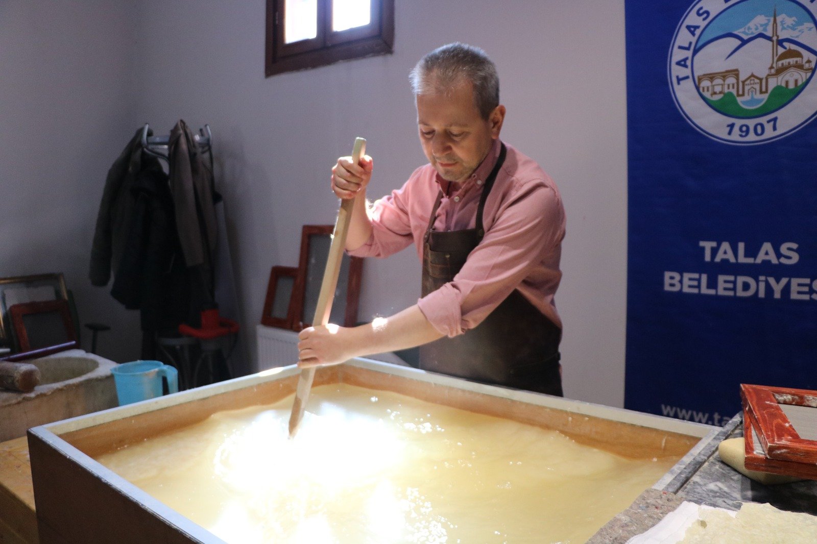 Kentte ‘Osmanlı Sokağı’ olarak bilinen Talas ilçesi Kiçikoy Mahallesi’nde yer alan tarihi Ali Saip Paşa Sokağı’nda yer alan 300 yıllık konak, Talas Belediyesi tarafından atölyeye çevrildi. Klasik Sanatlar Akademisi ismi verilen atölyede; Orta Asya’da 2 bin yıl önce kullanılan geleneksel yöntemlerle kağıt üretiliyor. İlçeye özgü ‘dut’ ağaçlarının dalları, kullanılmayan yiyecekler, giyilmeyen kıyafetler tarihi konaktaki atölyede geleneksel usulle öğütülerek sanatsal kağıt hamuru elde ediliyor. Tokmak ile dövülen hamur kağıdı, liflere ayrılıyor. Kalıplara alındıktan sonra keçe veya kabuk bezi gibi ince bir malzeme üzerine transfer edilen geleneksel kağıtlar ardından da oda sıcaklığında ya da gün ışığında kurumaya bırakılıyor. Kuruduktan sonra sanatsal kağıt olarak kullanılan lifli kağıtlar sanat eserlerine dönüşüyor ve bin yıllarca özelliklerini koruyor. Atölyede üretilen kağıtlar ve eğitim teknikleri ilerleyen günlerde açılması planlanan Kağıt Müzesi’nde sergilenmeyi bekliyor.